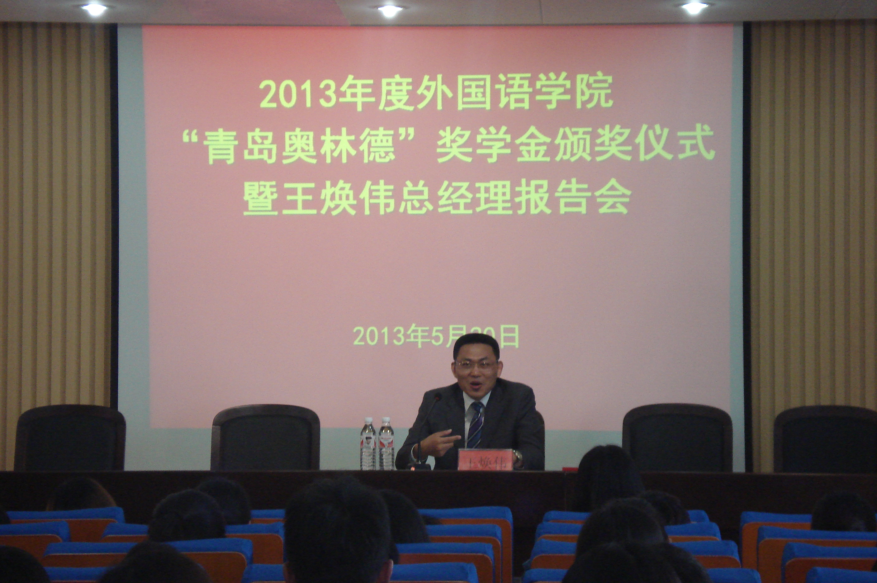 5月20日,bwin·必赢(中国区)官方网站-officialswebsi成功举行了2013年度“青岛奥林德”奖学金颁奖仪式暨王焕伟总经理报告会。青岛奥林德进出口有限公司总经理王焕伟,bwin·必赢(中国区)官方网站-officialswebsi党委书记李双立、党委副书记马海超,bwin·必赢(中国区)官方网站-officialswebsi两位校友、青岛奥林德进出口有限公司副总经理王莉明和贸易业务部部长甄婷婷出席了颁奖仪式和报告会。颁奖仪式和报告会由党委副书记马海超主持。